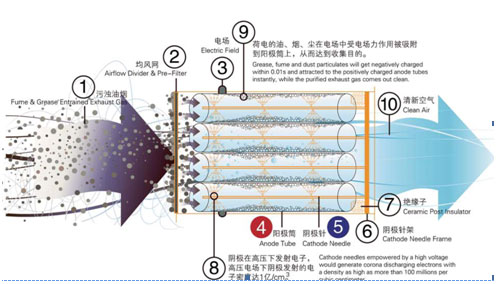 電場(chǎng)的設(shè)計(jì)使廢氣粒子的運(yùn)動(dòng)速度較低,一般在零點(diǎn)幾秒內(nèi)便能使廢氣粒子荷上足夠的電荷,帶電粒子在電場(chǎng)中會(huì)受到電場(chǎng)力(庫侖力)的作用,其結(jié)果是油煙粒子被吸附到陽極上。因此凈化率非常高,而且特別適用于捕捉粒徑較小和重量較輕的廢氣粒子。